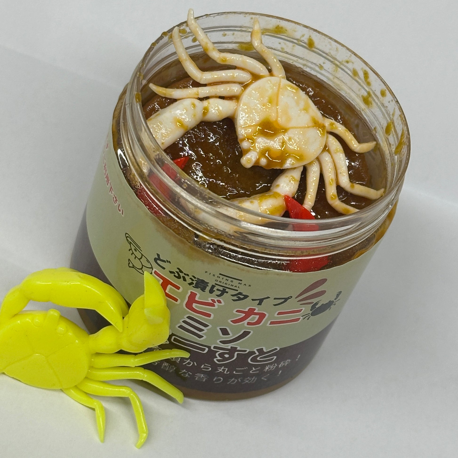エビカニを頭から丸ごと粉砕!ミソの芳醇な香りに、押江込蔵のアミノ酸集魚効果をプラス史上最強の集魚力を持つペーストが出来上がりました。オキアミ・キビナゴ・イワシなどの刺しエサを漬け込んだり、エギ・タコエギ・スッテ・ワームに塗っても効果絶大!