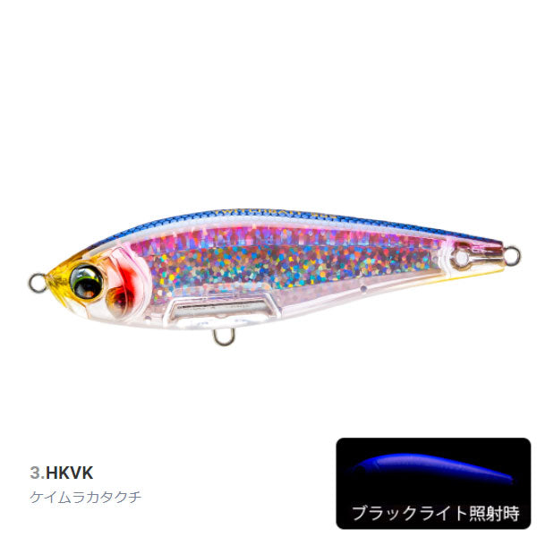 トゥイッチ&ポーズの簡単操作で楽しめる新感覚ルアー! 着水後は4回トゥイッチ→1秒ポーズの簡単操作で楽しめる新感覚ルアー。ただ巻きスローリトリーブではI字系アクション、速度を上げるとローリングアクションに変化。ゆっくり沈むスローシンキング仕様なので、シャローエリアの攻略にも最適。