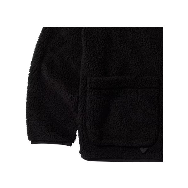 モコモコの風合いが心地良いボアフリースと、手触り柔らかなマイクロフリースを表裏で使い分け。両面ともに100%リサイクル素材で仕立てた、サステナブルなリバーシブルフリースジャケットです。広く開いた襟なしのネックラインで、レイヤードスタイルにも使いやすい1枚です。