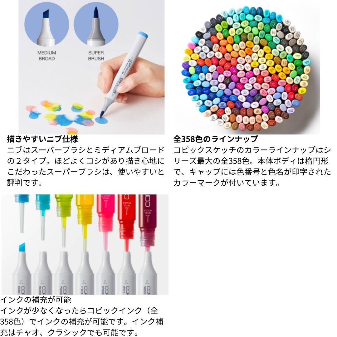 デザイン、イラスト、アートなどジャンルを問わず多くのプロにも愛用されているコピックのスタンダードモデルです。