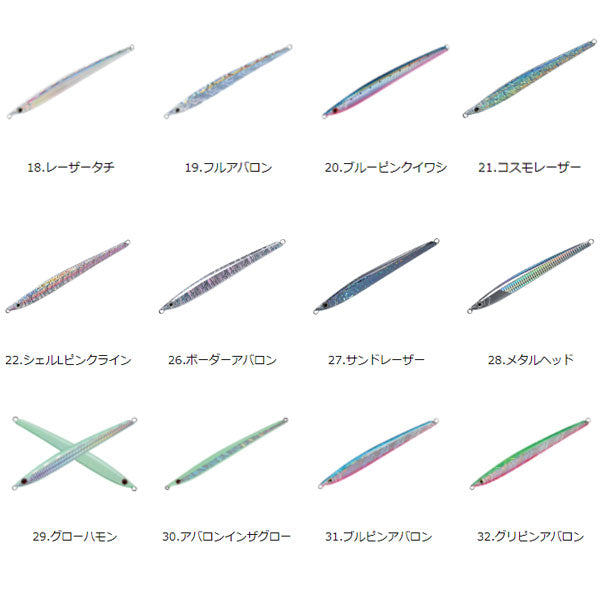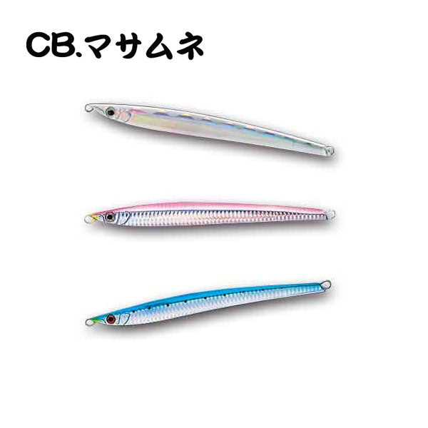 スロージギング対応、センターバランスメタルジグ 伝家の宝刀CB.マサムネは、近沿海でのジギングに焦点を当て、スロージギングのために開発したセンターバランスロングジグ。細身のロングボディーと水平志向の高アピール性を重視した結果、全ての長さを185mmで設計。水切れの良さと多彩なアクションを演出させるため、ボディーは限界まで薄くしてエッヂを効かせ、水圧を受けやすいフラット面を長く狭くとって、ショート、ミディアムストロークのスロージャークでも、タイトなアクションを可能にさせたレーザーエッヂバック&フラット形状です。