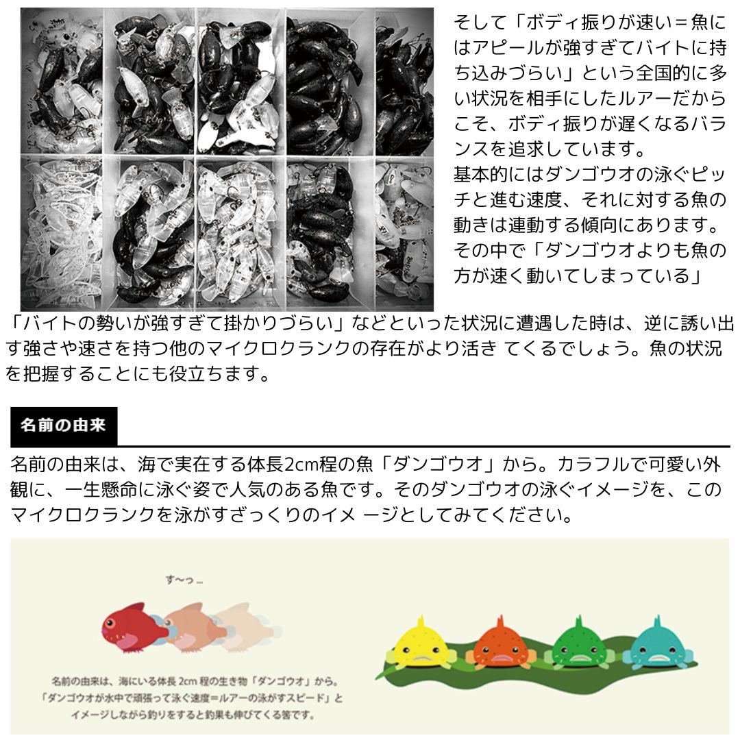 このダンゴウオに求めたのは、水中に漂う草の切れ端や泡と同じように自然界に溶け込む“水中同化がしやすいもの”であること。 こちらからそっとルアーを近づかせ、魚の目の前で気付かせ反応させる。逆に遠くにいる魚は気付かせないでおく、という発想です。 目の前に来て初めて喰い気を働かせ、移動距離を必要とせず安心して何度もその場でパクパクとくわえるイメージです。 それを再現しやすいものが無く、何とかそれを形にできないか?。そんな興味心からダンゴウオは生まれました。魚の目の前に来やすいモデルを選んで、ゆっくり、そしてそっと巻いてみてください。