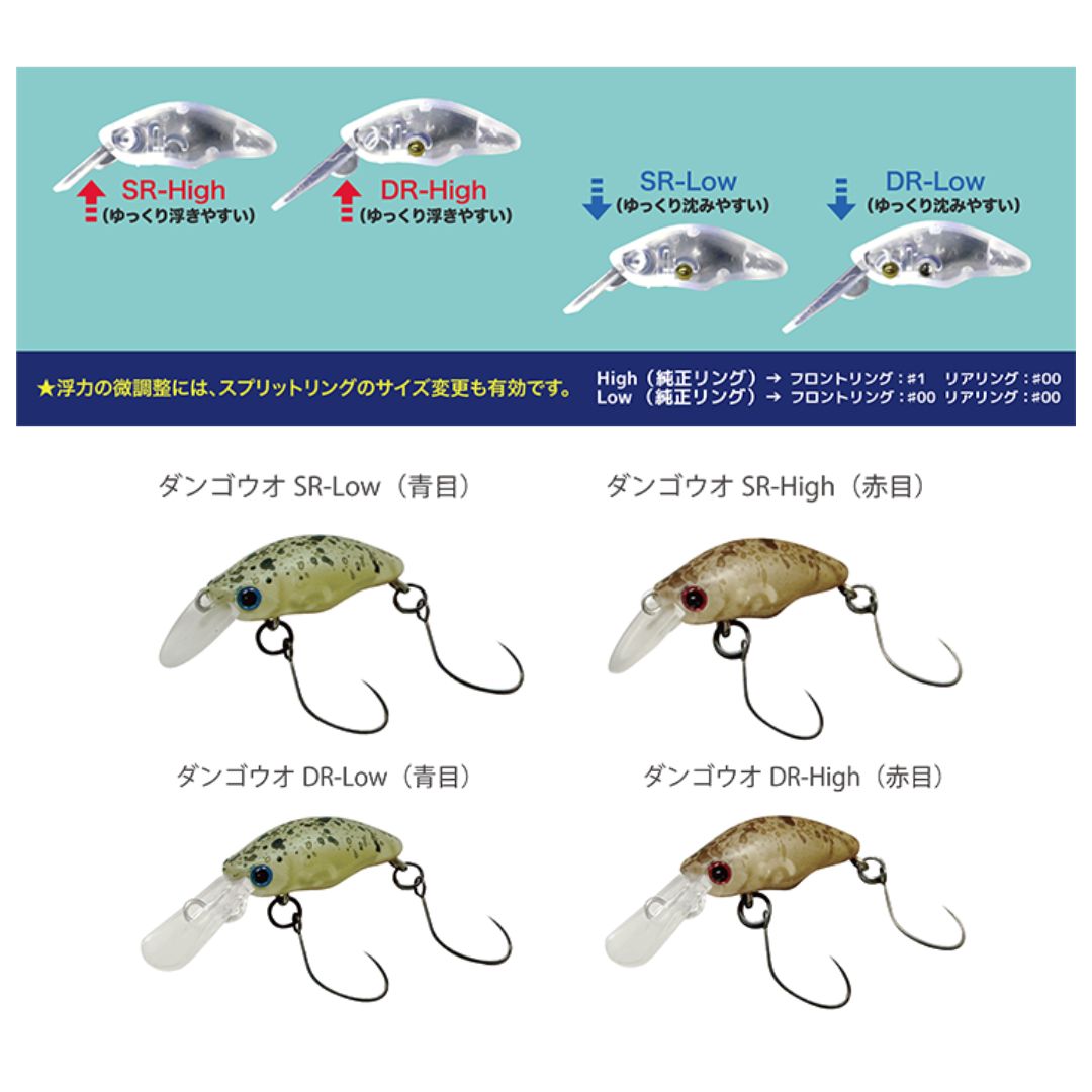 目視できるような浅い水深で魚がウロウロしているものの、追う距離が極端に短かったり、追い気が感じられない...そんな状況に遭遇したら迷わずSRタイプの出番です。まず魚の目線まで持っていく事が大事な 操作方法となりますので、そっとゆっくり巻きながら魚の目の前まで近づけて見てください。「スローな状況=難しい」ではなく「スローな状況=楽しい」という発想に逆転させられる力を持っています。逆テ ーパーのリップ形状を採用し「ふわふわ」とややテンションの抜けた浮遊感のある揺らぎウォブリングで誘います。僅かな巻きムラやラインテンションの変化でも喰わせ方向にアクション(振り幅)を持ってい きやすく、ラインテンションを軽く張っているだけでも喰ってしまうのは、つまみ喰い誘発型設計だからこそと言えます。ダンゴウオ入門は、まず迷ったら“SR-Low”からをお勧めします。