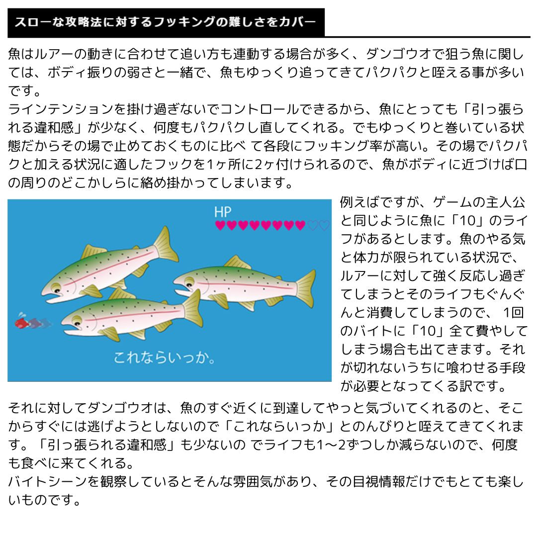 このダンゴウオに求めたのは、水中に漂う草の切れ端や泡と同じように自然界に溶け込む“水中同化がしやすいもの”であること。 こちらからそっとルアーを近づかせ、魚の目の前で気付かせ反応させる。逆に遠くにいる魚は気付かせないでおく、という発想です。 目の前に来て初めて喰い気を働かせ、移動距離を必要とせず安心して何度もその場でパクパクとくわえるイメージです。 それを再現しやすいものが無く、何とかそれを形にできないか?。そんな興味心からダンゴウオは生まれました。魚の目の前に来やすいモデルを選んで、ゆっくり、そしてそっと巻いてみてください。