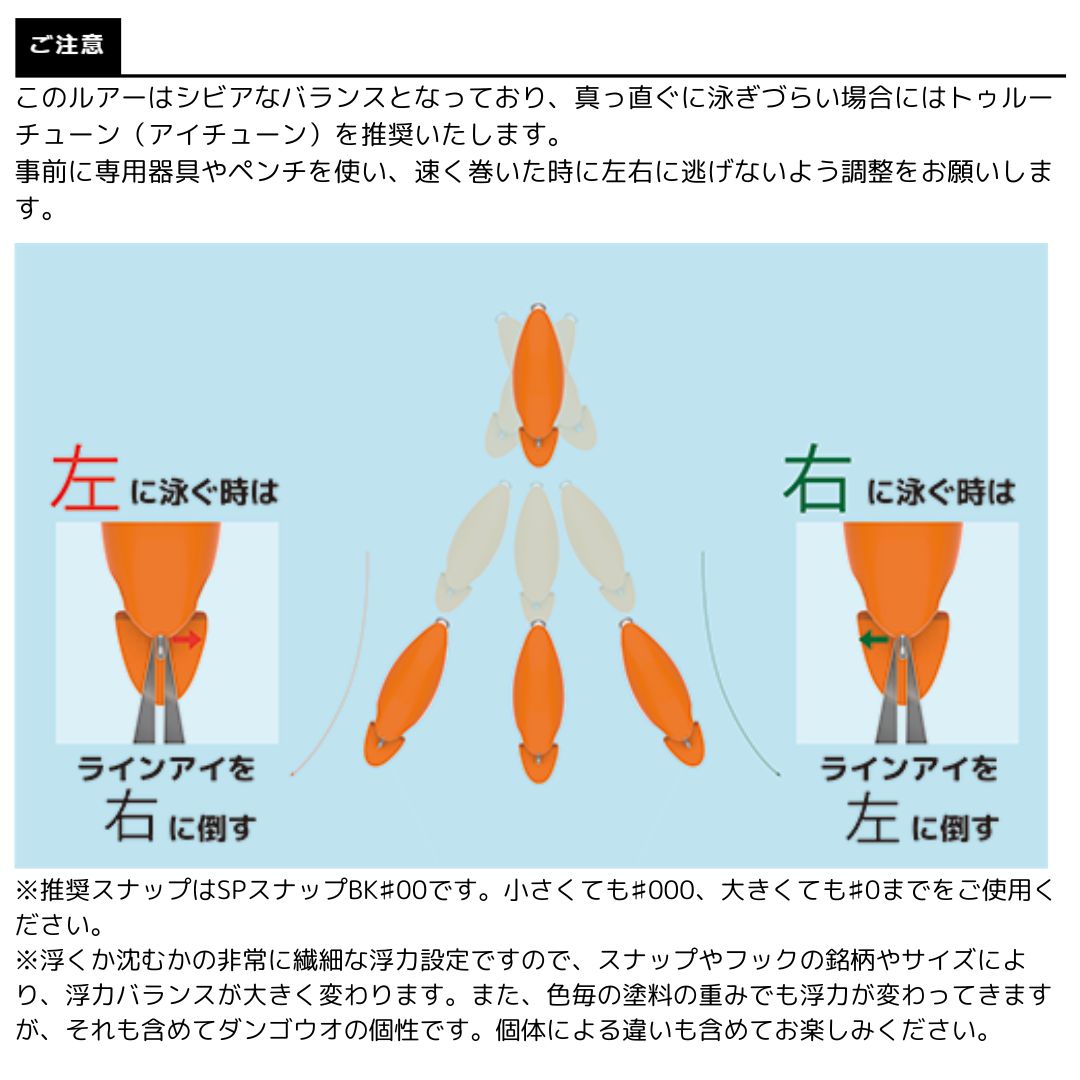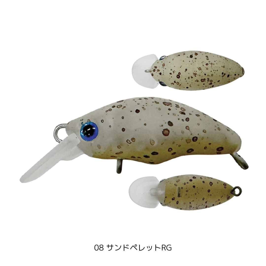 LENGTH:23mm WEIGHT:1.1g TYPE:ゆっくりと浮きやすい ※ルアーの塗装やライン、装着パーツにより浮き沈みに変化が生じます。 HOOK:オーナーばり カルティバ SBL-14♯9 RING:フロント・リア共:♯SPマイクロリングBK ♯00 ×1