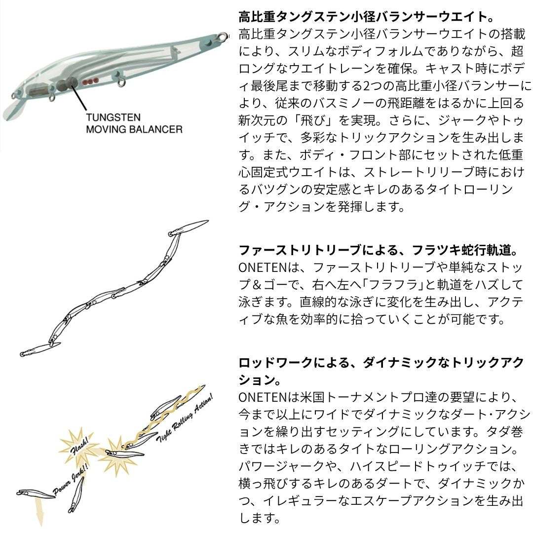 いずれにせよ、サイズを生かしたパワーと、タングステンウエイトをダブルで直列重心移動させる構造は、異次元のロングディスタンスキャストをもたらし、より遠く、より広くモンスターを探り当てるためのもの。ワンテンの圧倒的なパワーとポテンシャルは、日本のタフなフィールドにおいても存分に発揮されています。