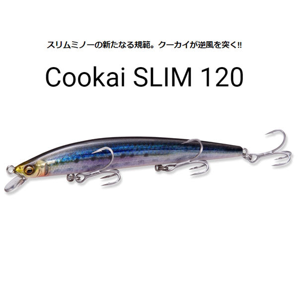 Cookai SLIM 120 は、港湾や河口、サーフ、干潟などショアからのシーバスゲームにおいて幅広く対応するハイレスポンス・スリムミノー。極限までスリムに突き詰めたボディ設計と、抵抗を徹底低減した極小のチップビルにより、低水圧でもしなやかなタイトピッチ・ロールアクションを発生。リアルベイトのような極細の線光明滅を放ち、食い渋るモンスタ-のバイトを誘います。また、スリムボディに搭載された、2つの高比重タングステンウエイトにカーボンスチールボールを加えた3連重心移動により、圧倒的なロングキャスタビリティを発揮。荒天時の逆風・強風下においてもロングディスタンスアプローチを可能にし、従来の同サイズミノーを遥かに上回る驚異的な飛距離を叩き出します。匠の技術が生み出した究極のスリムミノー、Cookai SLIM 120がシーバスゲームの新たな一手を切り拓きます。