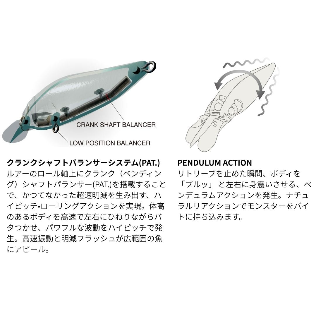 シャフトバランサー内蔵による驚異的なローリングとフラップ&スラップアクションで、日本のみならず海外においても唯一無二の評価を獲得してきたフラップスラップ。重心移動によるウエイトシフティングが招く挙動のロスを皆無とし、ボディフォルムの底部に沿って超低重心配置した特別なベンディングシャフト製バランサーは、アクションのロール軸から若干オフセットされてマウント。ロールアクションが変位するペンデュラムアクションを生み出し、スリムボディながらファットなクランクベイト並みの水流攪拌をもたらしています。これこそが「フラップスラップ」たる由縁。