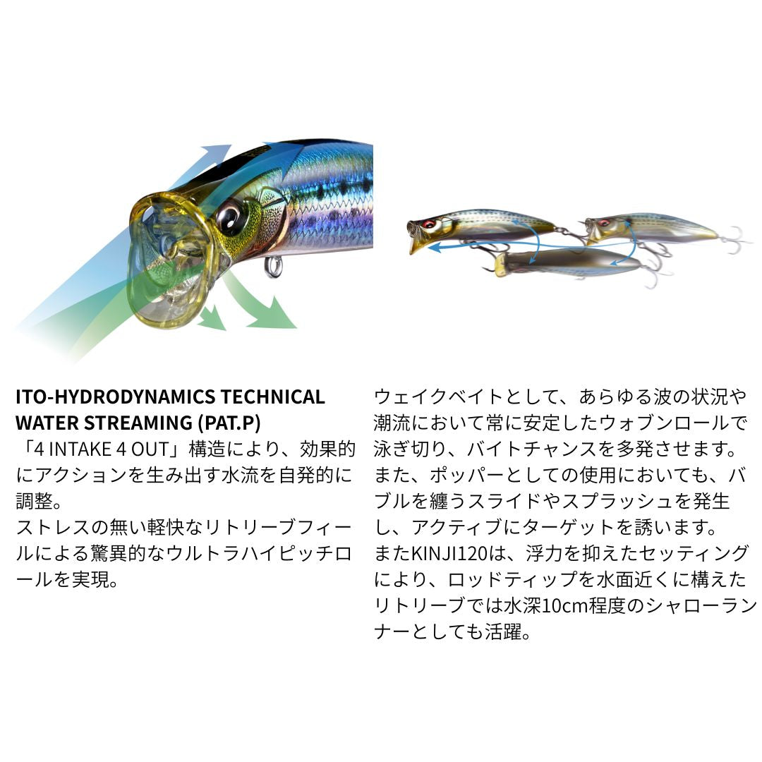 KIRINJI 120は、ITO独自のハイドロダイナミクス「4 INTAKE 4 OUT」構造(PAT.P)を搭載したスペシャルウェイクベイト。