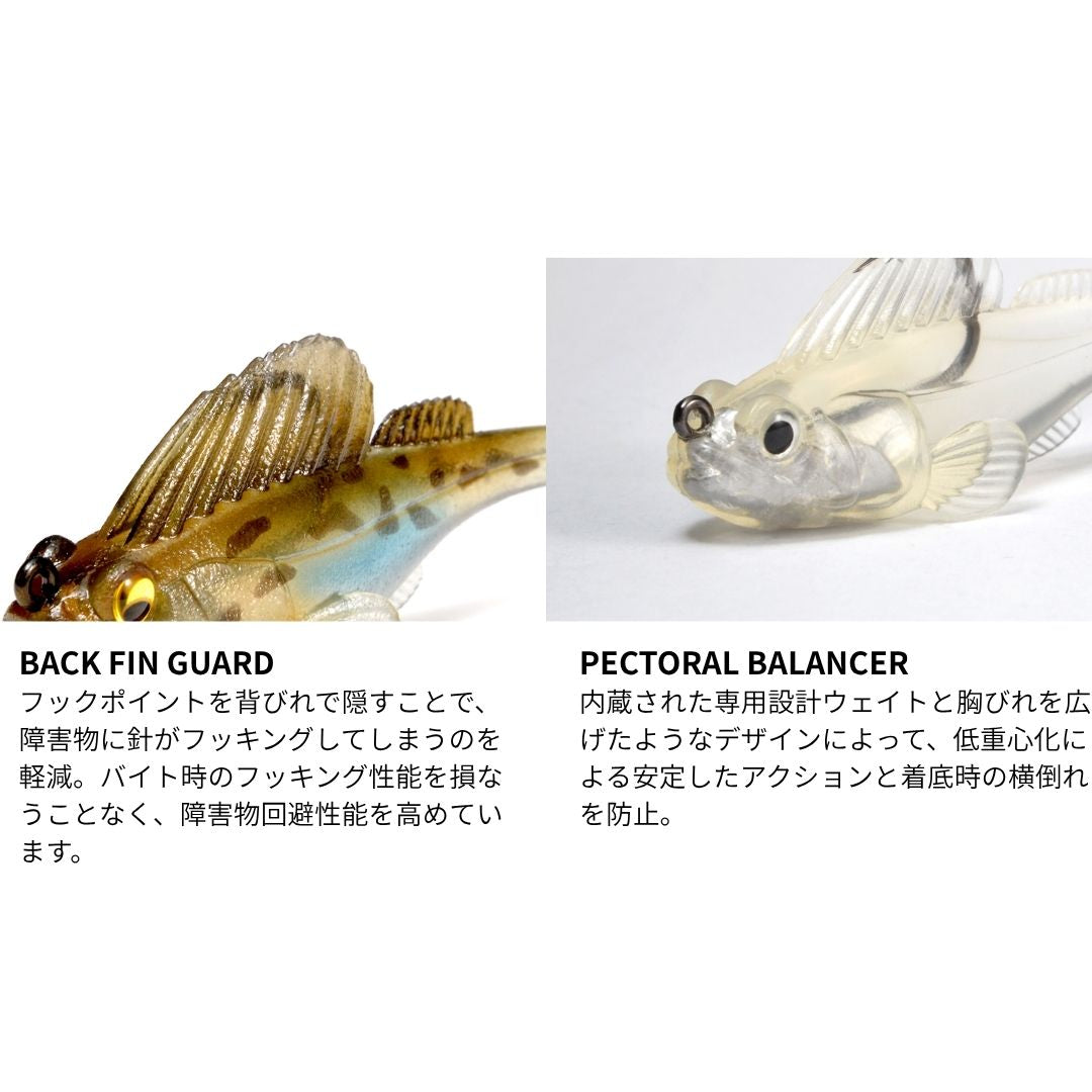低重心設計のウエイトバランスと胸びれによって横倒れを防ぎ、ベイトフィッシュライクな姿勢をキープ。前傾姿勢のフォールは、リトリーブだけでなくボトムバンピングなどでも使用可能。