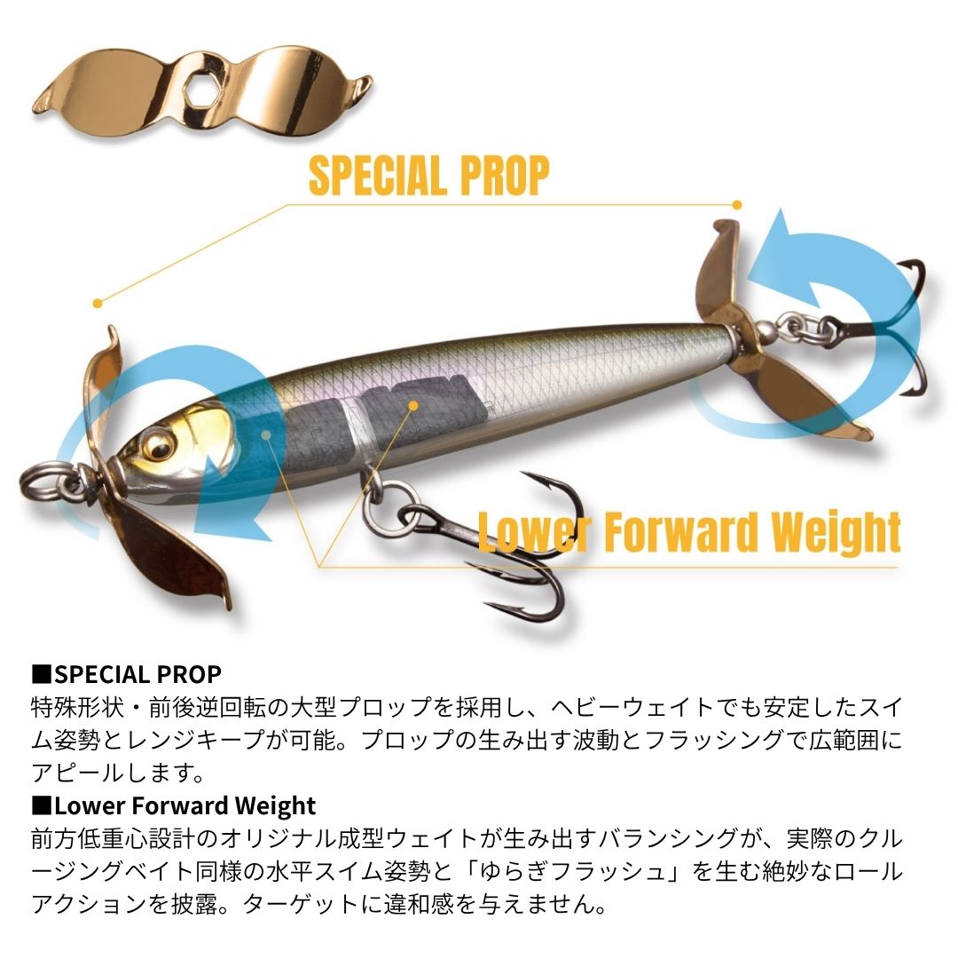 一口サイズの「低重心・ヘヴィウェイテッドボディ」は、圧倒的なロングキャスタビリティを実現。狙いのレンジに速やかに到達し、広域のターゲットにアピールするサーチベイトとして威力を発揮します。