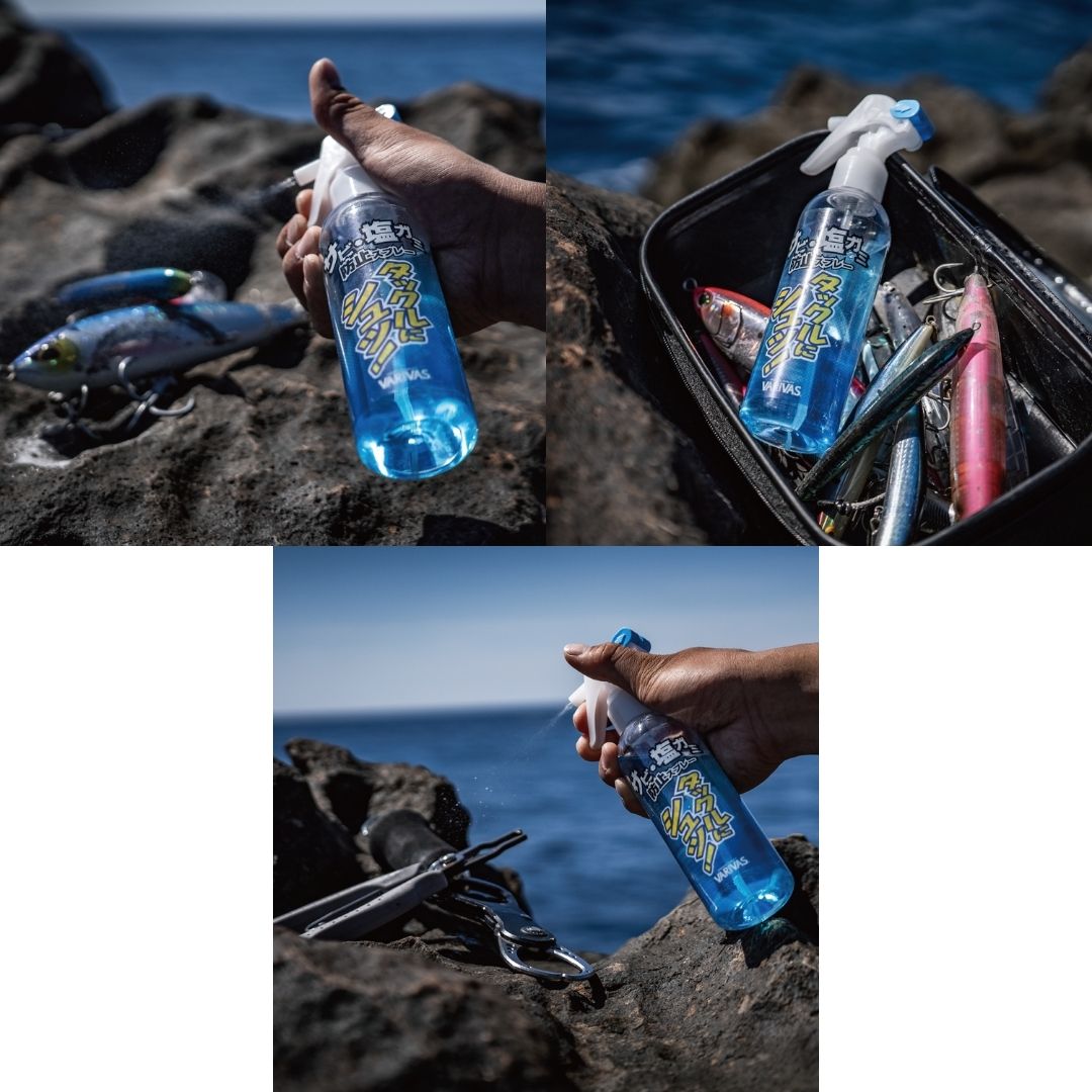 釣り終了後、釣り場でシュッ!シュッ!とタックルにまんべんなく噴き付け、帰宅後に道具を水洗いし、乾燥させてください。電動リールにもご使用できますが、水洗いができないリールは濡れタオルで十分に拭き取ってください。