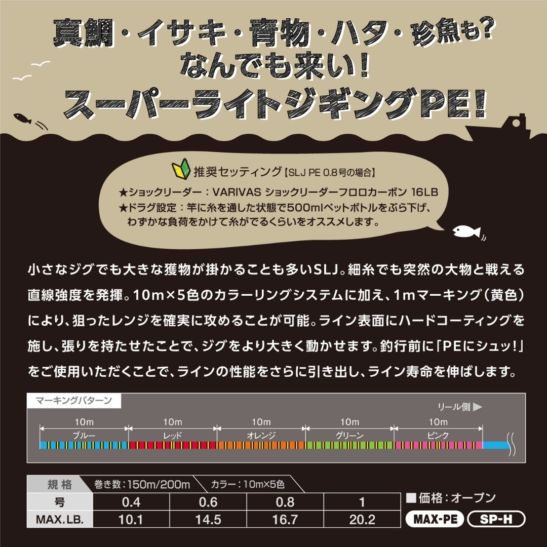 小さなジグでも大きな獲物が掛かることも多いSLJ(スーパーライトジギング)。細糸でも突然の大物と戦える直線強度を発揮。10m×5色のカラーリングシステムに加え、1mマーキング( 黄色)により、狙ったレンジを確実に攻めることが可能。ライン表面にハードコーティングを施し、張りを持たせたことで、ジグをより大きく動かせます。