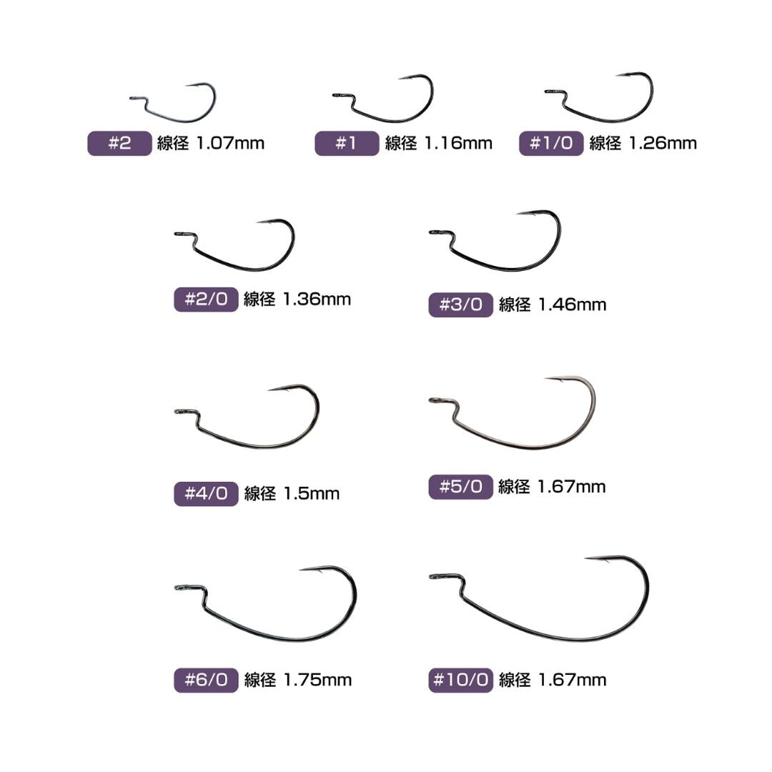 超ヘビーワイヤー採用により、抜群の強度を誇るモンスタークラス。ヘビーワイヤーでありながらモンスターの硬いアゴをぶち抜くグランポイント採用。超バルキーなワームのセッティングに最適なスーパーオフセット設計。また、シャンクの長さ、ポイントの位置、セッティングシルエットなど、細部に渡って考え抜かれた形状を実現。