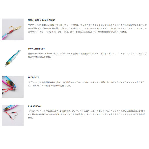 開発の発端は「誰でもカンタンに釣れるジグが欲しい!」という純粋な欲求から。近年、ビギナーでも楽しめるソルトルアーフィッシングの入門編として定着したスーパーライトジギング・ブレードゲーム・ライトショアジギングなどの釣りを、さらに面白く、さらにカンタンにするために、オートマチックに釣れるジグが欲しい…この欲求を数多のコダワリと共に具現化した。素材はシルエットそのものをコンパクトにおさめられる高比重のタングステン素材を選択し、センターからややフロント寄りに重心があるオーソドックスな形状にデザイン。よりコンパクトな食わせのシルエットで、フルサイズのジグでは口を使わない極小ベイト偏食型のターゲットでもイージーにバイトに持ち込むことが可能。また、小型ながらもしっかりとした重量があるので、素早いフォールやロングキャストもストレスなく出来る。そして、食わせの性能を更にワンステップ上げるため、全長19mmの極小ウィローリーフブレードをリアフックに搭載。ヤミージグの心臓ともいえるこのパーツは、フィッシュイーターに噛みつかれた瞬間に剥がれるベイトフィッシュのウロコのキラメキや、瀕死の小魚が出す微弱な波動を水中で表現。フィッシュイーターの捕食本能を強烈に刺激し、タダ巻きはもちろんのこと、ジャークや速巻きなど、どんなアクション入力でもバイトを量産する。その他にも、フック、アイ、カラーに至るまで、釣れる要素を細部に至るまで妥協することなく落し込んだ。小さな見た目とは裏腹の大きな釣果…アングラーを歓喜に導くタングステンブレーデッドジグを手に取り、全国各地デ無双セヨ!