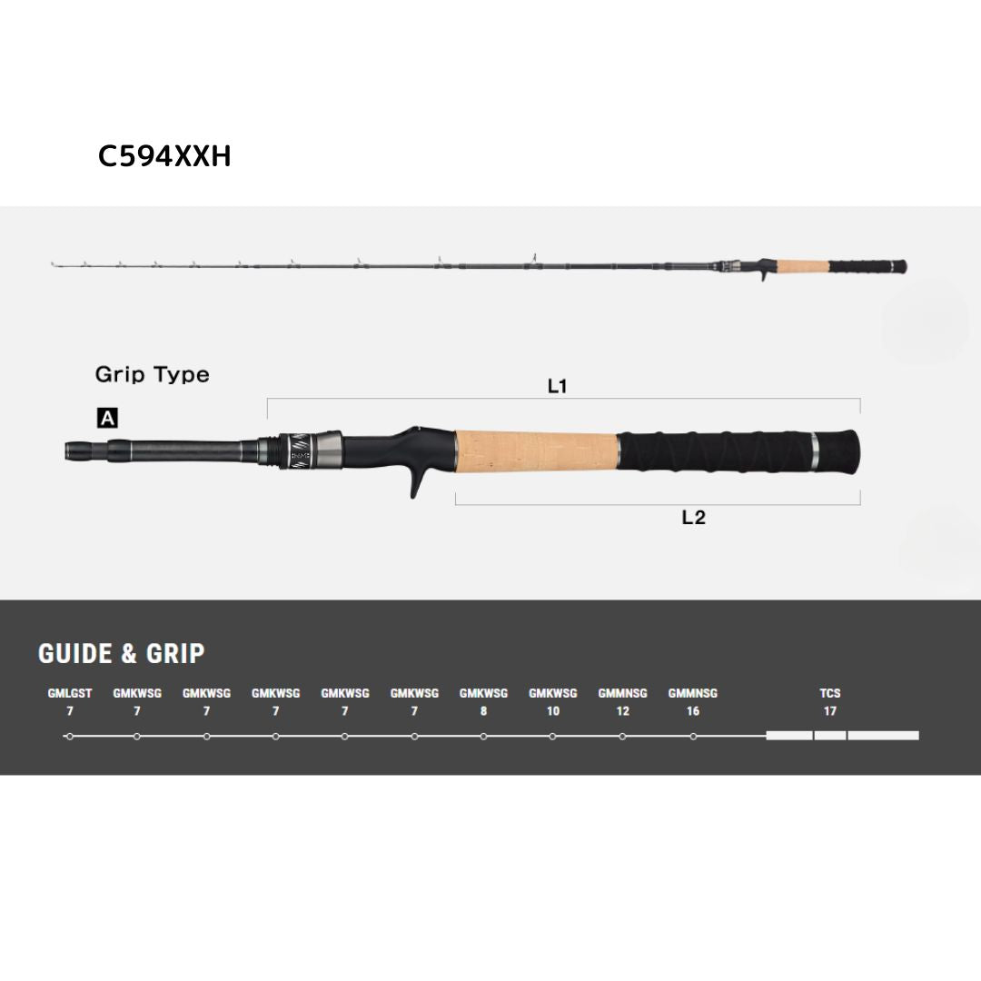 【C594XXH】LENGTH(ft.in):5'9" PIECE:4 CLOSED LENGTH(cm):49 ROD WEIGHT(g):172 LURE WEIGHT(oz):1.5-8 LINE WEIGHT(lb):PE max 6 L1(mm):380 L2(mm):260 GRIP TYPE:A JAN CODE:4516508 15857 1