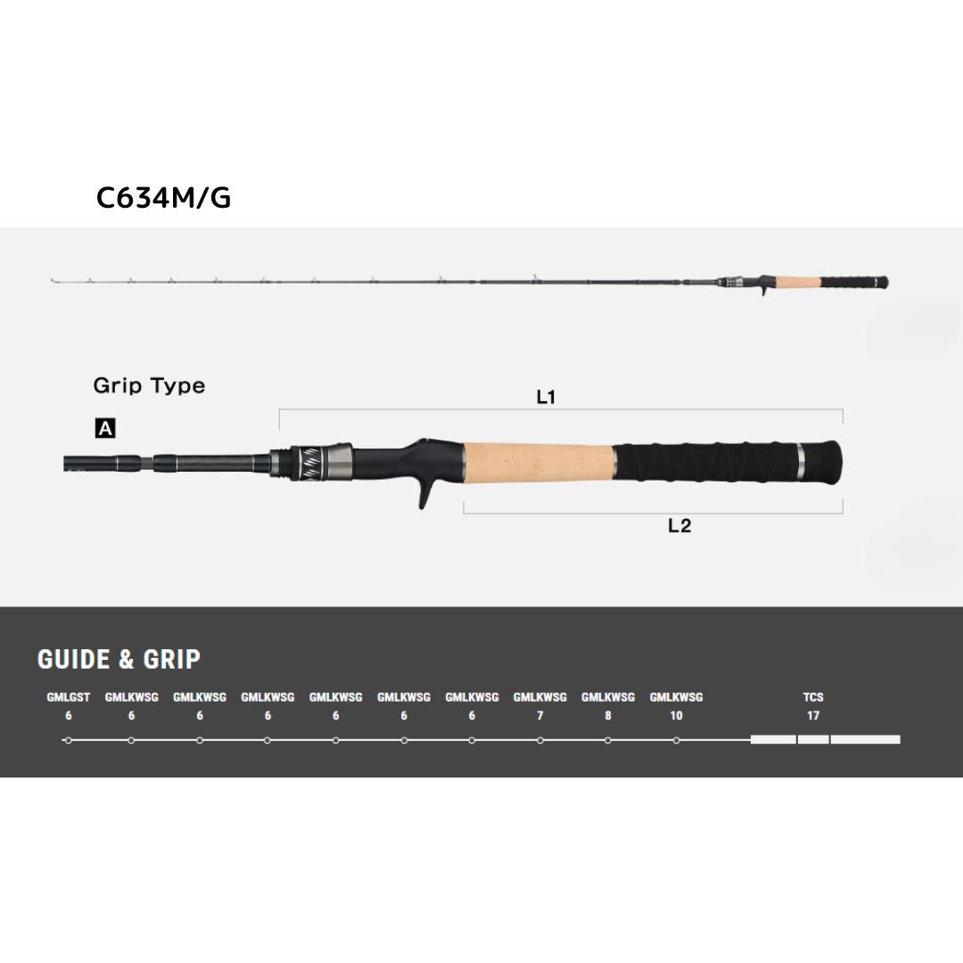 【C634M/G】LENGTH(ft.in):6'3" PIECE:4 CLOSED LENGTH(cm):52 ROD WEIGHT(g):163 LURE WEIGHT(oz):3/16-1 LINE WEIGHT(lb):8-20 (lb) L1(mm):370 L2(mm):250 GRIP TYPE:A JAN CODE:4516508 15859 5