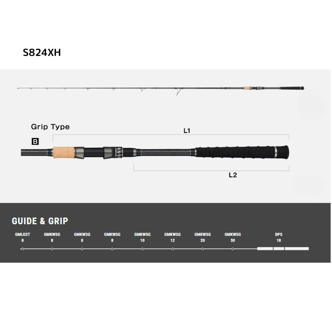 【S824XH】LENGTH(ft.in):8'2" PIECE:4 CLOSED LENGTH(cm):67 ROD WEIGHT(g):213 LURE WEIGHT(oz):1/4-3 LINE WEIGHT(lb):12-35 (lb) L1(mm):500 L2(mm):330 GRIP TYPE:B JAN CODE:4516508 15862 5