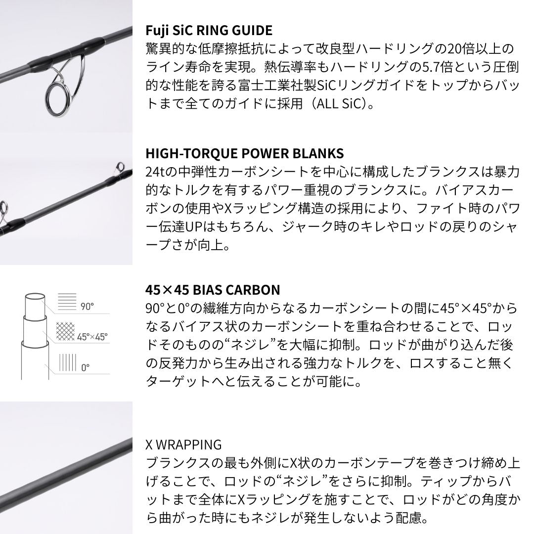 ジギングロッドにおける至上命題──それは「ジグを意のままに操れる高い操作性」。反発力に優れた中〜高弾性カーボンを採用し、速いテンポの誘いや鋭いジグ操作に即応するハイレスポンス性能を実現。さらに45°×45°バイアスカーボンを多層構造で配置し、高弾性ロッド特有の「粘りの喪失」を克服。しなやかなトルクと復元力も両立させたジギングロッド。