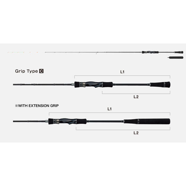 LENGTH(ft.in)6.0/6.4* PIECE 1&H CLOSED LENGTH(cm)110 ROD WEIGHT(g)113/139* LURE WEIGHT(g)40-160 LURE WEIGHT(号)10-40 LINE WEIGHT(PE)max 1.0 L1(mm)420/540* L2(mm)300/420* GRIP TYPE C
