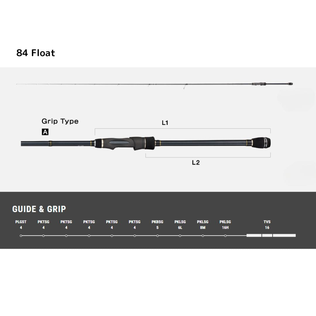 MODEL:84 Float LENGTH(ft.in):8'4" PIECE:2 CLOSEDLENGTH(cm):130 RODWEIGHT(g):112 LUREWEIGHT(g):max 20 LINE WEIGHT(PE):0.4-0.8 L1(mm):360 L2(mm):250 GRIPTYPE:A JAN CODE:4516508 17129 7