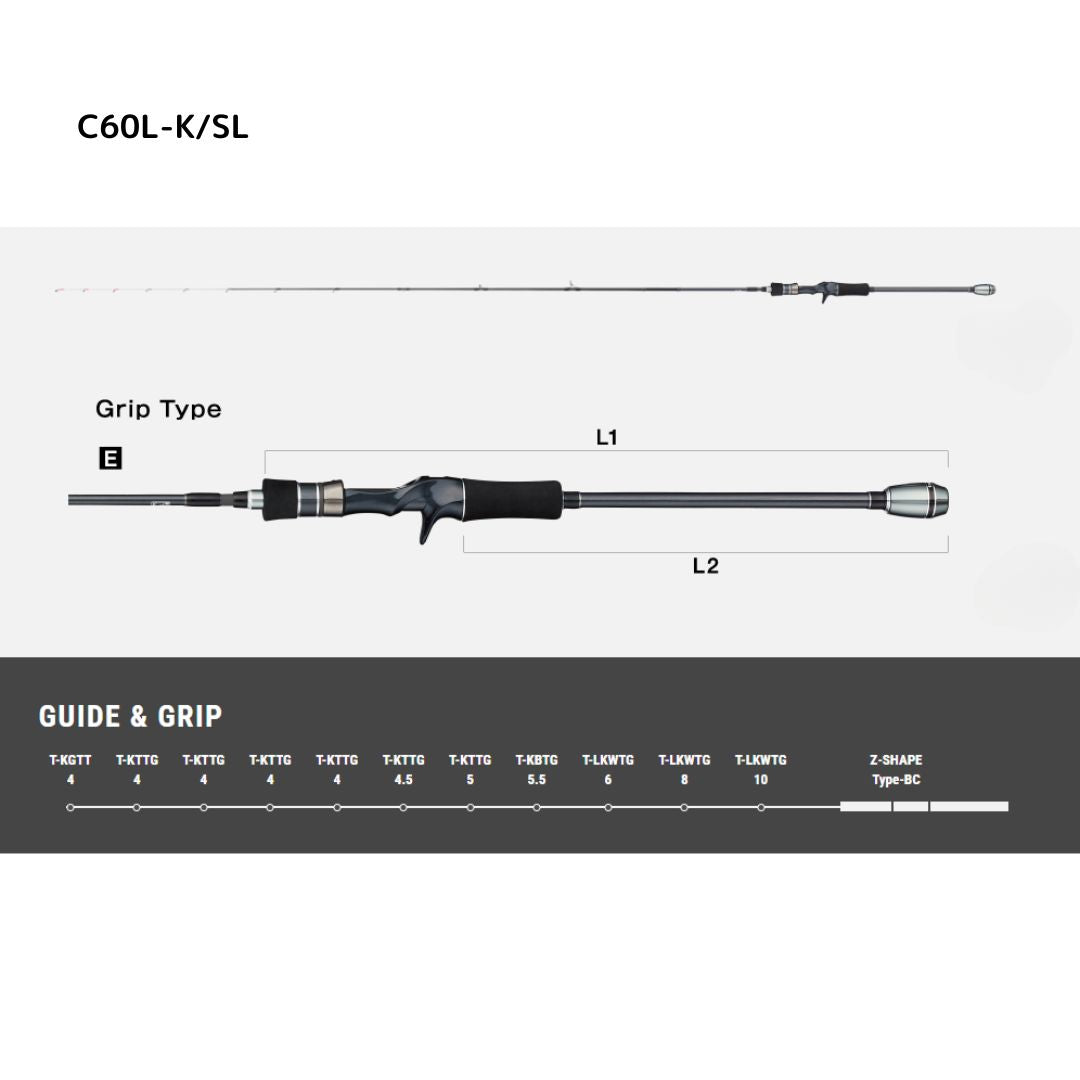 【C60L-K/SL】LENGTH(ft.in):6'0" PIECE:2(B) CLOSEDLENGTH(cm):145 RODWEIGHT(g):100 LUREWEIGHT(g):12-60g/3-15号 LINE WEIGHT(PE):max 0.8 L1(mm):430 L2(mm):305 GRIPTYPE:E JAN CODE:4516508 17135 8