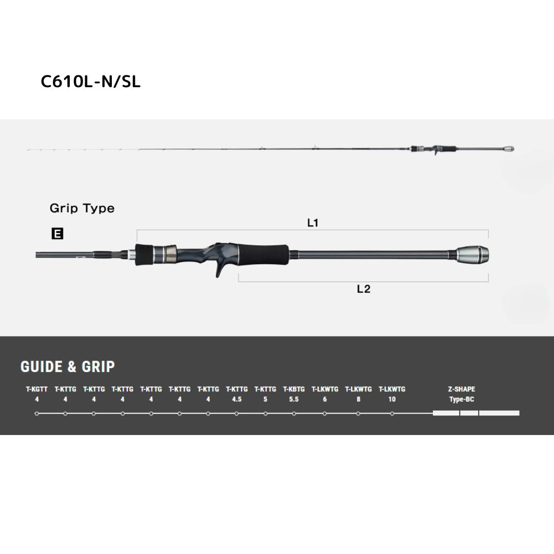 【C610L-N/SL】 LENGTH(ft.in):6'10" PIECE:2(B) CLOSEDLENGTH(cm):171 RODWEIGHT(g):107 LUREWEIGHT(g):12-60g/3-15号 LINE WEIGHT(PE):max 0.8 L1(mm):430 L2(mm):305 GRIPTYPE:E JAN CODE:4516508 17136 5