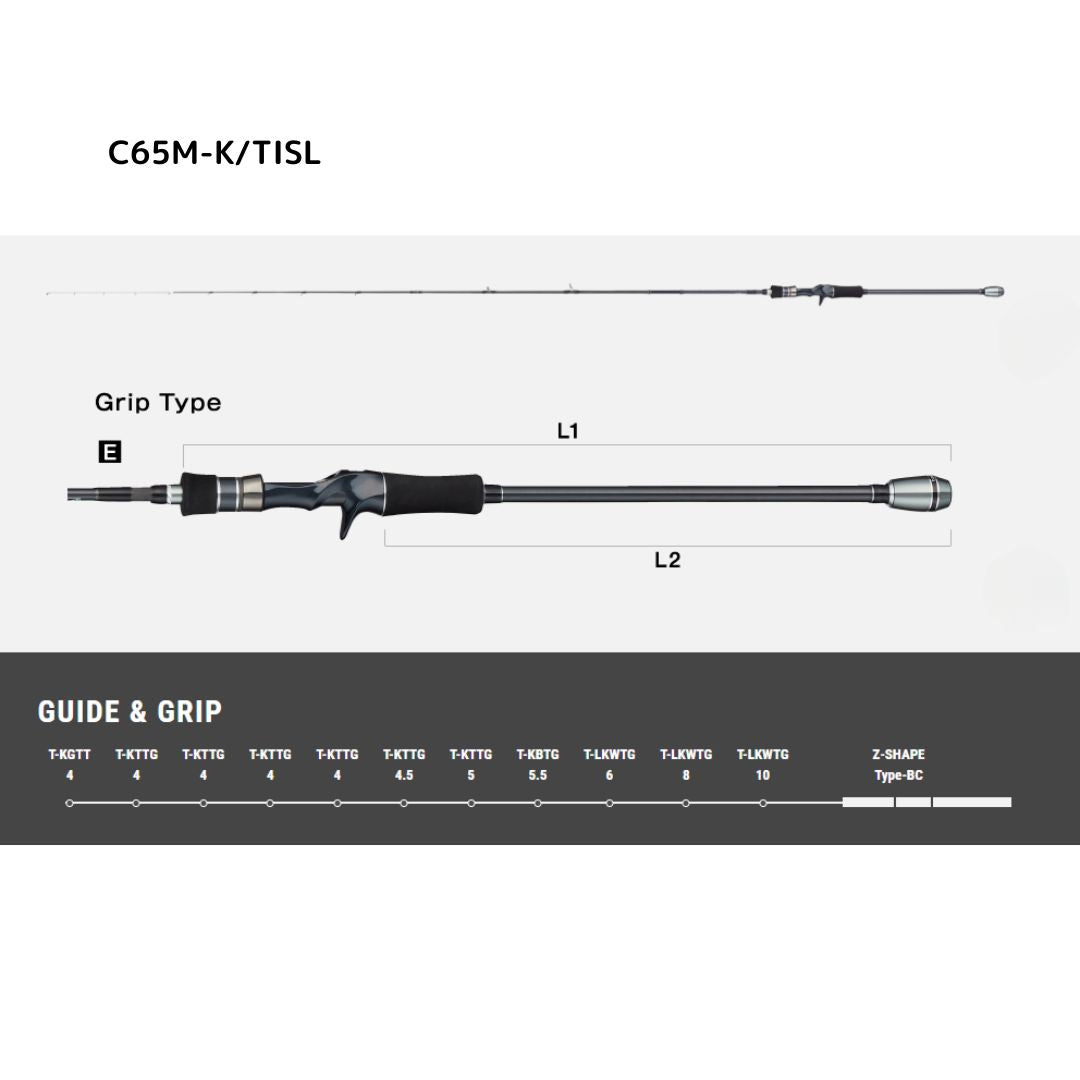 【C65M-K/TISL】LENGTH(ft.in):6'5" PIECE:2(B) CLOSEDLENGTH(cm):153 RODWEIGHT(g):112 LUREWEIGHT(g):20-100g/5-25号 LINE WEIGHT(PE):max 0.8 L1(mm):475 L2(mm):350 GRIPTYPE:E JAN CODE:4516508 17137 2