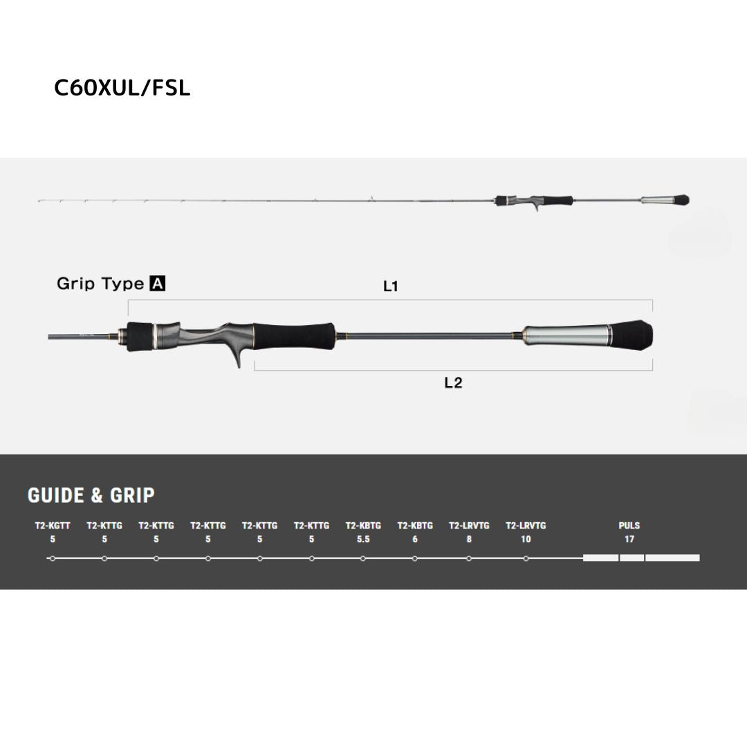 【C60XUL/FSL】LENGTH(ft.in):6'0" PIECE:1&Half CLOSEDLENGTH(cm):115 RODWEIGHT(g):120 LUREWEIGHT(g):max 120 LINE WEIGHT(PE):max 0.8 DRAG (kg):max 1.0 L1(mm):530 L2(mm):400 GRIPTYPE:A JAN CODE:4516508 17138 9