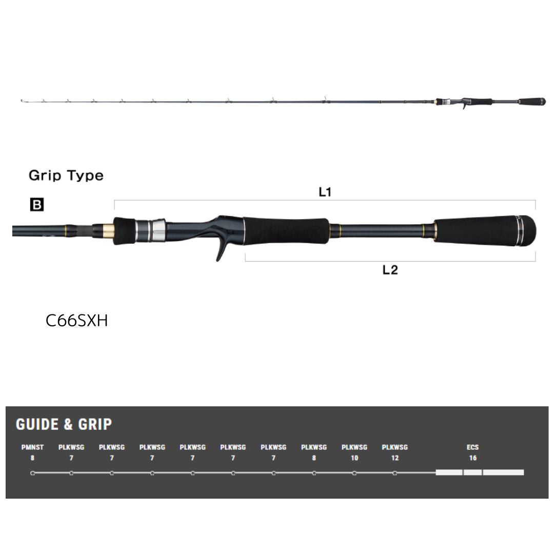 MODEL | LENGTH(ft.in) | PIECE | CLOSED LENGTH(cm) | ROD WEIGHT(g) | LURE WEIGHT(g) | LINE WEIGHT(PE) | L1(mm) | L2(mm) | GRIP TYPE | JAN CODE |