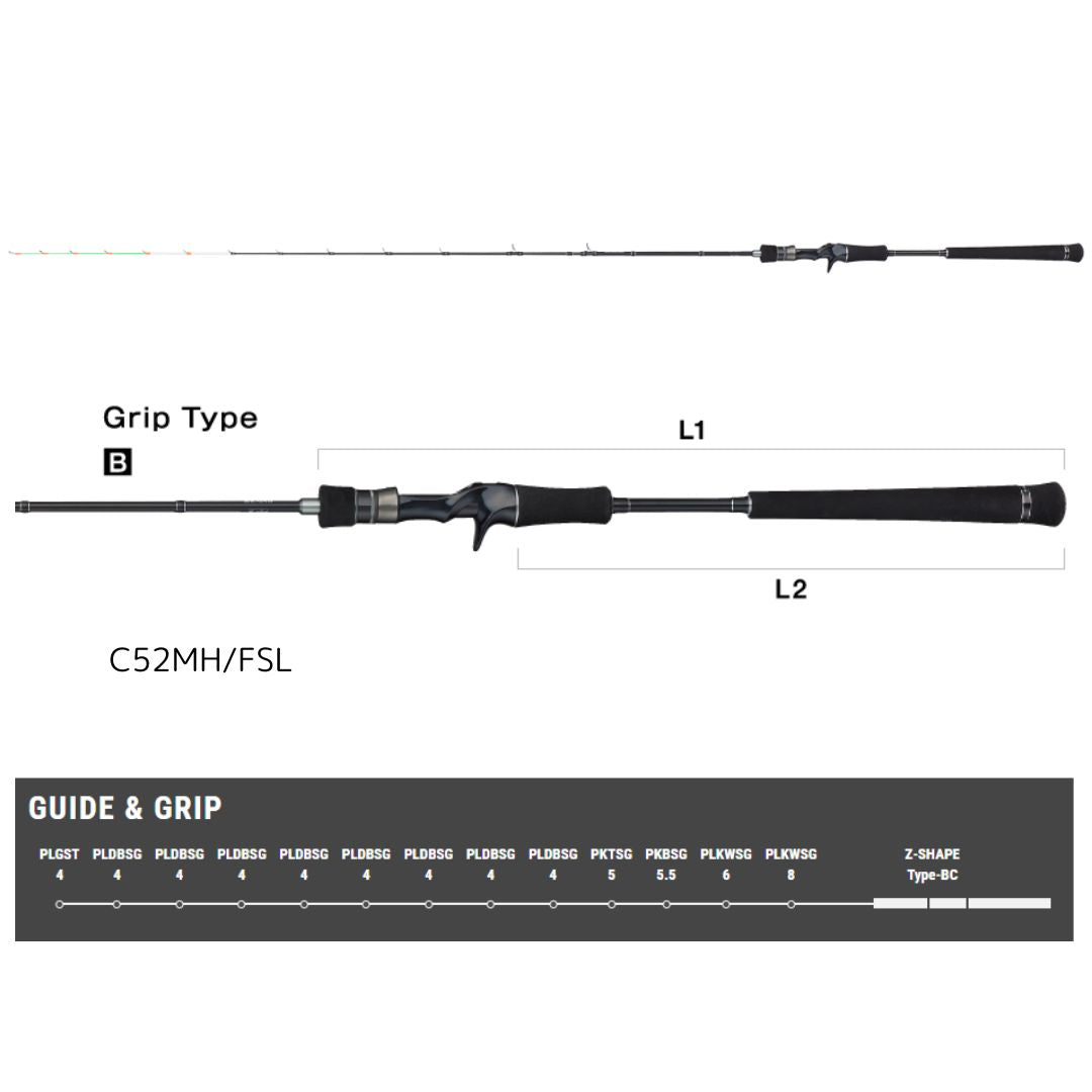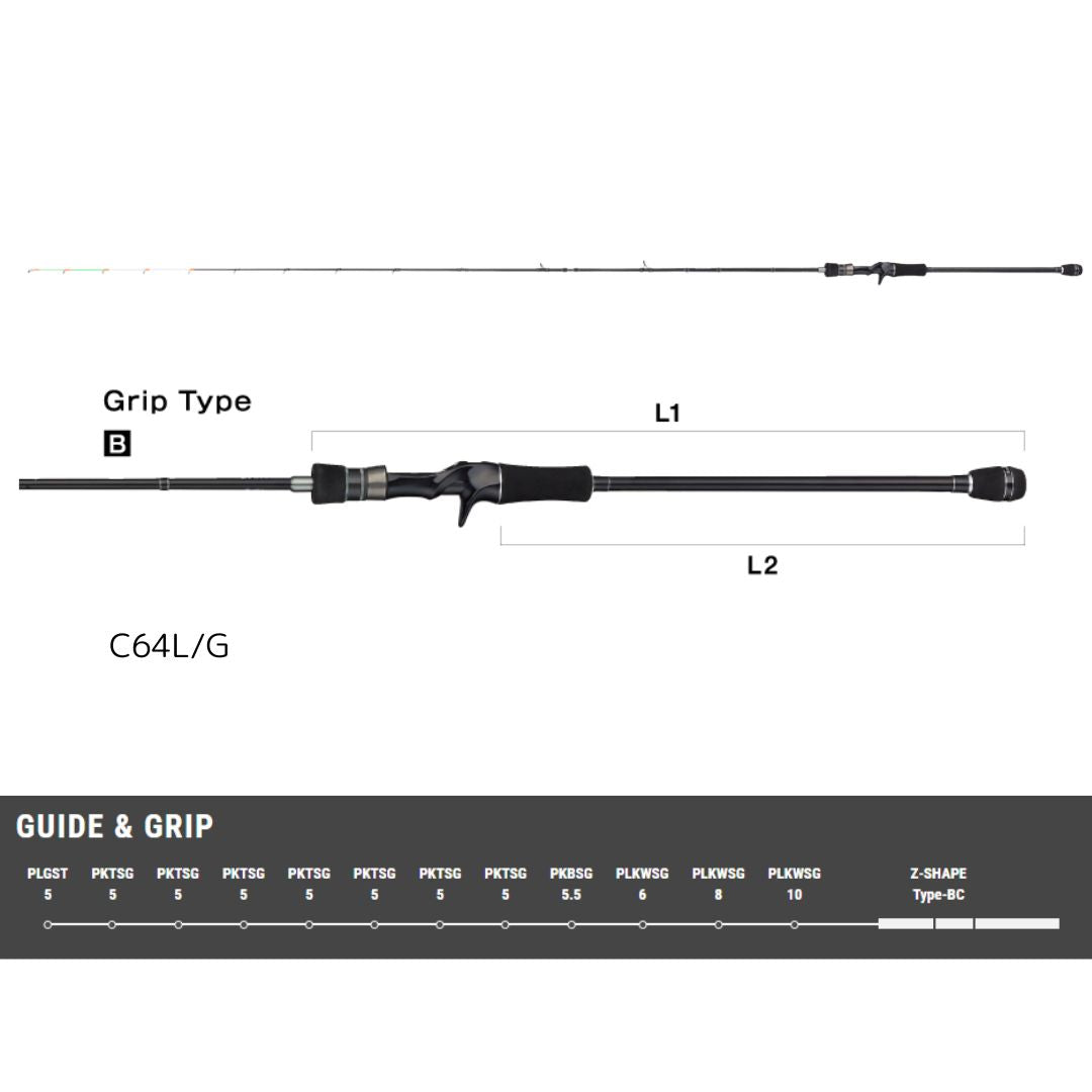 MODEL | LENGTH(ft.in) | PIECE | CLOSED LENGTH(cm) | ROD WEIGHT(g) | LURE WEIGHT(g) | LURE WEIGHT(号) | LINE WEIGHT(PE) | L1(mm) | L2(mm) | GRIP TYPE | JAN CODE |