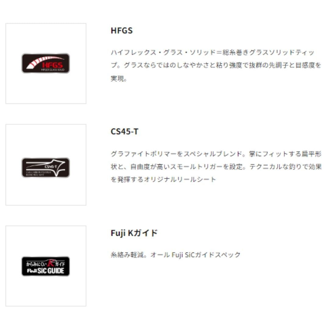 | MODEL | 全長 (m) | 継数 (本) | 仕舞 (cm) | 標準自重 (g) | 先径 (mm) | 元径 (mm) | 錘負荷 (号) | L1 (mm) | L2 (mm) | JANコード |