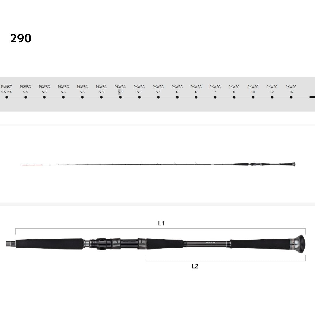全長(m):2.9 継数(本):2 仕舞(cm):148 標準自重(g):300 先径(mm):2.5 元径(mm):15 錘負荷(号):150-250 L1(mm):650 L2(mm):360 JANコード:4516508519815