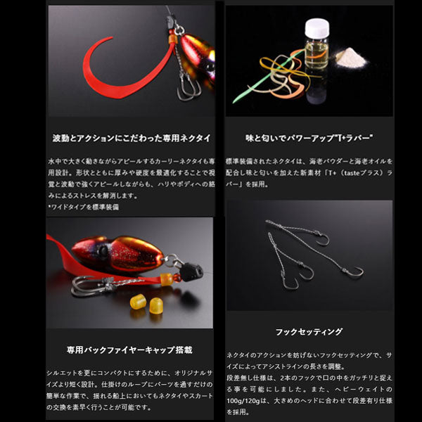 コンパクトシルエット ヘッド、スカート、ネクタイが一連の従来の漁具型ルアーと異なり、ボディとネクタイ+フックを別パーツとして構成。さらに並列にセットしボリューム感を抑えたことでコンパクト化を実現。ボディへのバイトもフッキングに持ち込みます。二枚潮をつき抜ける直進性能 流線型ボディをぶら下がり式にセッティング。水の抵抗を抑えた整流効果によって潮流に負けない速いフォールとファストリトリーブでもバランスを崩さず安定したアクションを可能にしました。あらゆる魚種がターゲット マダイ、ブリ、ヒラメ、アコウやカサゴなどのロックフィッシュまで、幅広いターゲットでオフショアゲームを楽しくします。