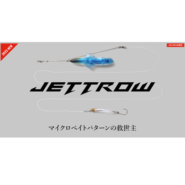 「小さいルアーは飛ばない」を完全克服 マイクロベイトパターン攻略には、ルアーサイズを落とすことが有効。しかしサイズを落すと飛距離が落ちてしまうというジレンマを経験した方も少なくないはずです。ジェットローは、シラスサイズのマイクロルアーを、ヘビーミノー並みの飛距離で飛ばすことが可能。「サイズを落とすと届かない…」を完全に克服します。 飛ばしと寄せの本体、喰わせのバディ 天秤形状をしたジェットロー本体が“飛ばし”とスプラッシュによる“寄せ”を担い、その後方を追うように泳ぐシラスサイズのバディ(喰わせルアー)にバイトさせるという仕組み。小型ルアーに足りない飛距離だけでなく、アピール力も補うことができます。 ルアーロッドで快適に 全長を約160cmに抑え、10ft前後のロッドでも快適にキャストや操作が可能な設計。飛行時は本体が先行し、バディが追従するため、そのまま着水するとバディのフックが本体に絡むトラブルが発生することがあります。着水直前にスプールを指で軽く押さえサミングし、ジェットロー本体より沖側にバディを着水させることで、トラブルを防ぐことができます。 使用方法 使い方は至ってシンプルで、遠投してジェットロー本体が水面を滑るようにただ巻きするだけ。本体が水中に潜ってしまう時は巻き速度が遅すぎor竿を寝かせすぎ、逆に水面から飛び出してしまう時は巻き速度が速すぎor竿の立てすぎです。綺麗に水しぶきをあげていることを確認しながら、巻き速度、竿の角度を調節してみてください。