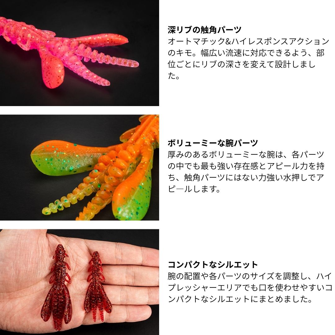 甲殻類のずっしりとした波動を演出する腕パーツ、ベイトフィッシュの波動をイミテートした触角パーツを持ち併せ、エビ・カニをはじめ、ハゼ系のボトムに潜むベイトフィッシュやイカなどを捕食しているパターンにベストマッチ。リフト&フォールをメインに、ズル引きやスイミング、シェイキングなどあらゆるアクションに対応します。