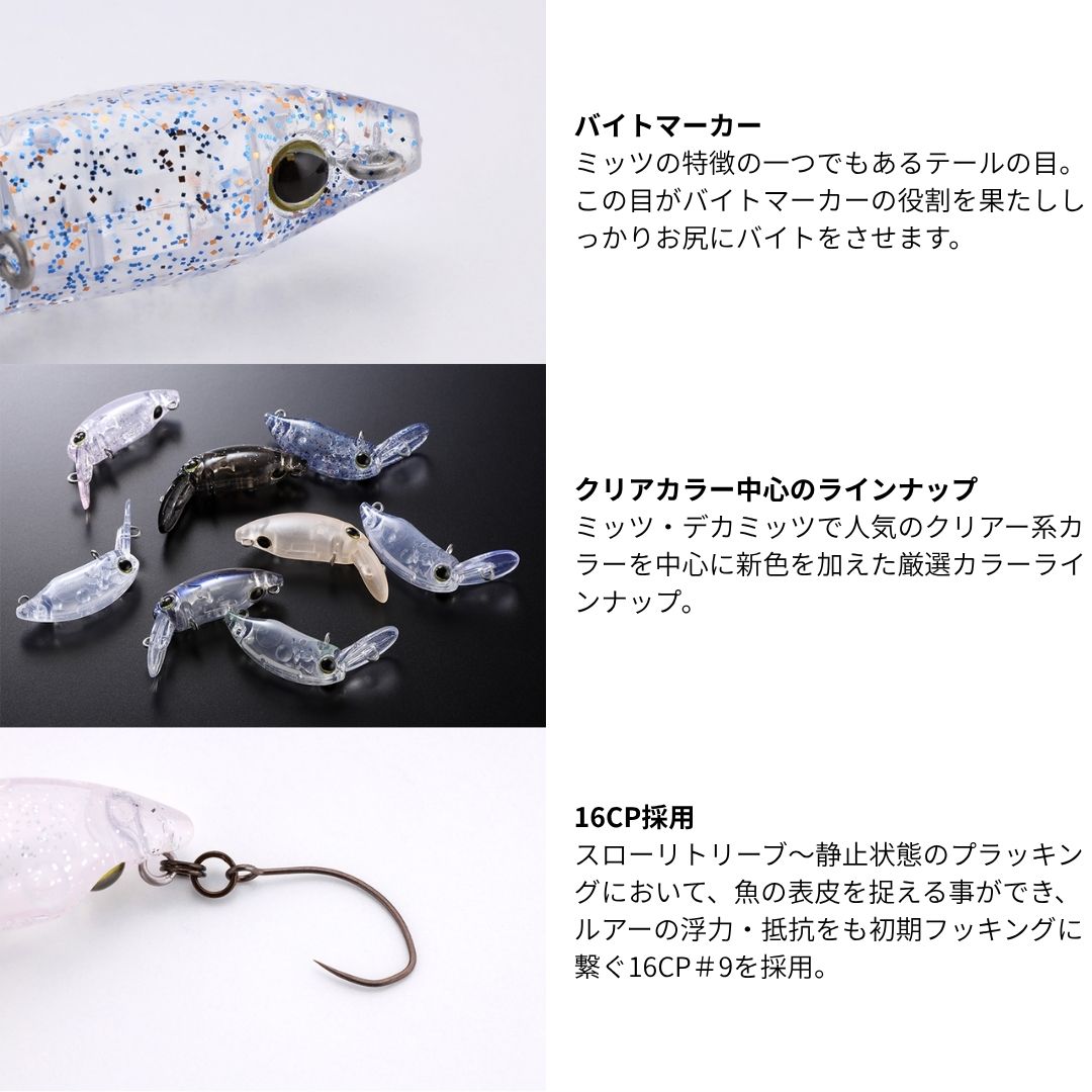 全長28㎜と小型な為、魚に違和感なく口を使わせることが可能となります。プレッシャーにより大きいシルエットでは口を使わない状況下で威力を発揮します。遠投可能でアピールの強いデカミッツとは違う場面で活躍します。