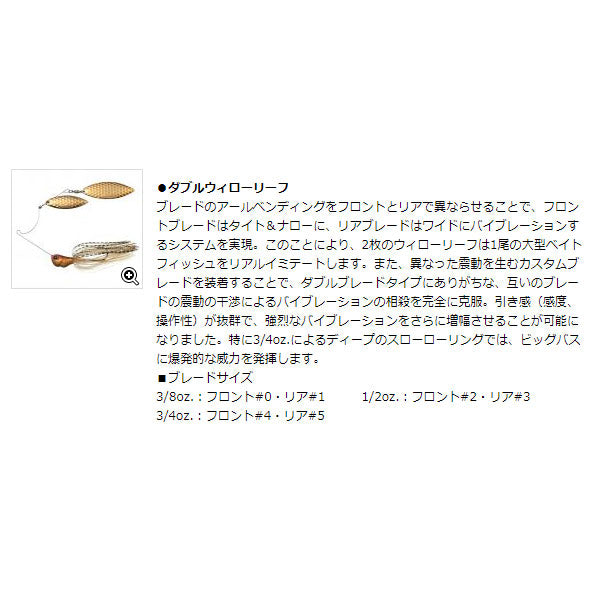 デカバスを呼ぶ機能を追求した結果、折れる危険性も合わせ持った諸刃の剣。しかし、その威力は完全に弱点を凌駕する…。1レースのみに照準を絞ったフォーミュラマシンと同一のコンセプトから生まれた、清水盛三が放つトーナメントスペシャルスピナーベイト。おそらく日本でも最もデカバスを仕留め続けているスピナーベイトはD-ZONEだろう。そう言える程、D-ZONEは圧倒的な支持と共にデカバスの実績を確実に重ねているのだ。真似の出来ない、デカバスを引きつけてやまない波動。喰ってきたバスを確実に掛けて獲る力。清水盛三の自信。競技用スピナーベイトD-ZONE。
