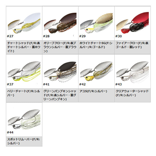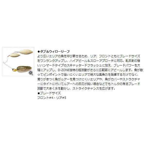 1レースのみに照準を絞ったフォーミュラマシンと同一のコンセプト。デカバスキラーの名をほしいままにし、国内外のトーナメントで華々しい実績を誇るモンスタースピナーベイト“D-ZONE”。その血統を受け継ぎ、よりトルクフルなブレードを装着したものがD-ZONEパワーブレードだ。トルクフルで抵抗の大きいブレードは、ノーマルモデルより浅いレンジをスローにアプローチすることができ、強烈なフラッシング、強力な波動で広範囲にアピールすることができる。アメリカの広大なトーナメントレイクにおいても絶大な集魚力を誇り、ノーマルモデルと使い分けることで幅広いレンジ攻略を可能にした。スピナーベイトで確実に結果を残すために繰り返しテストされ生み出された、超実戦型盛三チューンドモデル“D-ZONEパワーブレード”。