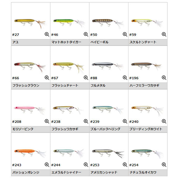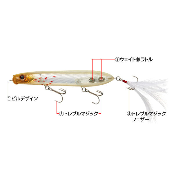 全長10.5cm 自重16.3g タイプ フローティング 潜行レンジ- 推奨タックル Rod:ミディアムライト~ミディアムヘビー6'0"~7'0"ベイトロッド Line:フロロカーボン12~16lb. or ナイロン12~20lb. リング(スナップ)サイズ【ラインアイ】 #3,【フックアイ】 フロント:#3・センター:#3・リア:#3 フックサイズ【EGトレブルマジック】 フロント:#6・センター#6・リア:#6