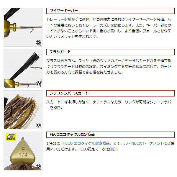 グラス対応のラバージグ。究極の形。 抜群の対グラス(ウィード)すり抜け性能を有する大西健太プロデュース・グラスリッパー。しかし、ただグラスに絡みにくいだけのジグではありません。あえて適度なスタック感を付加することで、手元に伝わる感度がアップするのと同時にすり抜けた後にストライクゾーンから大きく離れるのを防ぎます。さらに、高く跳ね上がり真下に落ちる理想的な跳ねアクションで、手前への移動を抑えてバスの目の前でしっかりアピールできます。そのうえ、低速から高速リトリーブまで対応の安定スイム姿勢、アピール力&ナチュラル感を高めるヘッドウォブリング・スイミングアクションまでも併せ持つ、跳ねてよし、巻いてよしのグラスジグの究極形です。また、その回避能力&操作性により、ウィードのみならずブッシュ、リーズ、ゴミ溜り等、あらゆるカバー撃ちに広域対応する性能も併せ持ちます。