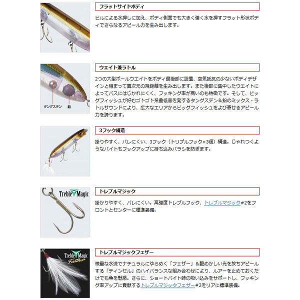 後方重心かつ空気抵抗の少ないボディ形状に加え、シリーズ中最大サイズ&質量のボディから生み出される異次元の飛距離。今まで攻めきれなかったスポットや魚にアプローチできます。