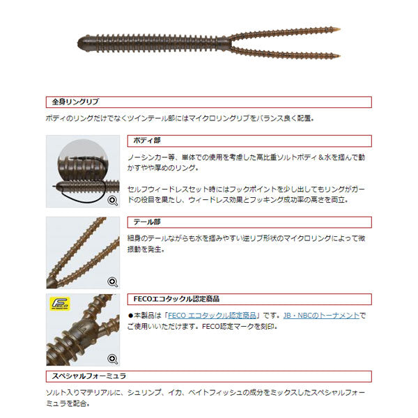 あらゆるリグに対応する魅惑のツインテール。ツインテールリンガーはボディ部のリングデザインのみならず、細身のテール部にもマイクロリングデザインを施したツインテール・リングワームです。ネコリグ、ドロップショットリグ、テキサスリグ、キャロライナリグ、スプリットショットリグ、ノーシンカーリグからラバージグトレーラーとして、あらゆるリグに幅広く対応。適度に張りのある高比重ソルトボディとリングリブで水を掴んで動かします。さらに、水を掴みやすい形状のリングテールは、左右別々に微振動することでバスの本能を確実に刺激します。その姿はバスからは喰いやすい手長エビや、時には襲うべき逃げ惑うベイトフィッシュに見えているに違いありません。また、シュリンプ、イカ、ベイトフィッシュのスペシャルフォーミュラを配合。視覚だけでなく嗅覚も刺激することで、さらなるバイトを誘発するだけでなく、バスが口に入れたときに生物的感触を持つリング形状と相まって、バスが離しにくくミスバイトを減少させる効果も高めました。張りのあるボディ&複雑な微振動を生み出すツインテールはスピナーベイトやブレーデッドジグのトレーラーとしても最適。ハードな使用に対応しながらも、複雑にうねるようなアクションでバスを魅了します。