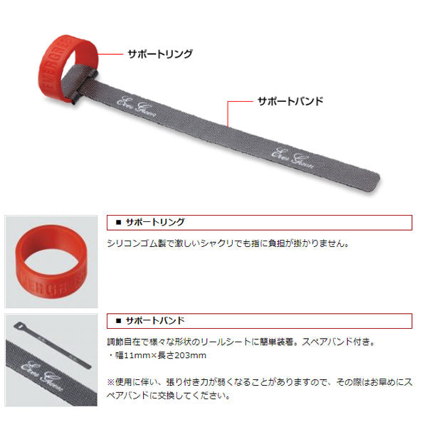 ベイトリールを1日使うとロッドを持つ腕が疲れる~という方、いませんか?ジグやエギをシャクる時だけでなく、ただパーミングしているだけでも、ロッドを落とさないようにと無意識のうちに力を入れて握り込んでしまうもの。当たり前だと思ってあきらめていたそんな疲れを解消するためのサポートグッズ、それがE.G.パーミングサポーターです。?調節自在のサポートバンドで様々な形状のリールシートに簡単装着。?軽い力で握るだけで抜群の安定感、長時間のパーミングによる疲労を軽減。?サポートリングはシリコンゴム製、激しいシャクリでも指に負担が掛からない。