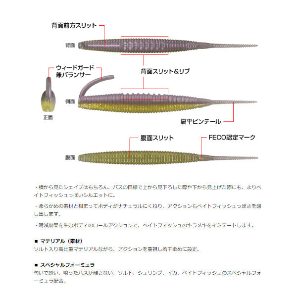 フィッシュイーターの本能を刺激するシルエット、アクション、波動……あらゆるリグで様々なベイトフィッシュを演じるピンテール。ワカサギ、コアユ、シラウオ、ハスっ子、イナッコ、サヨリ、モツゴ、モロコ、オイカワ、ウグイ、果ては小バスまで……全国各地のフィールドに存在する様々なベイトフィッシュを演じるために、様々なリグや使い方に対応するピンテール。小魚系ベイトをたらふく喰らうコンディション抜群のルアーには見向きもしない回遊系のセレクティブなバスから、ベイトの回遊ルート上に定位する待ち伏せ型の狡猾なビッグバスまで、あらゆるフィールドのフィッシュイーターに。