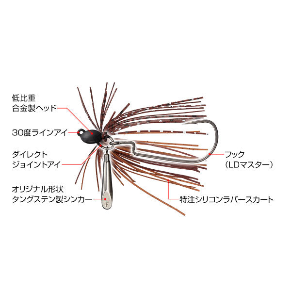 リーダーレスダウンショット×ラバージグのハイブリッド種。・垂直にフォールさせやすい。・ボトムでワームの姿勢が安定する。・根掛かりしにくい。・浮き上がりにくい。・感度が良い。・すり抜けが良い。・適度なスタック感がある。・ワームがズレにくい。・ラバーのモザイク効果がある。・バスがどの方向からも吸込みやすい。・フッキングが良い。21世紀のカバー&ボトム攻略スタンダードとなる新種リグが発生。