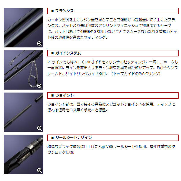 圧倒的軽快感を誇る小沼のミドルレングス・バーサタイルモデル。 卓越した追従性でフックアウトを大きく軽減する小沼のストリームフィールド攻略モデル・「ZAGS-96R ストリームウィップ96」をベースに8'7"へとミドルレングス化。超軽量ブランクスと袖絡みの少ないグリップデザインの融合により、これまでの常識を覆すほど軽快に取り回せるMLバーサタイルモデル。圧倒的な軽快感により、1日中振り続けることが極めて容易。また、長いロッドや重いロッドではどうしても操作感がぼやけてしまう5g程度の小型プラグや軽量ジグヘッドリグをより細やかに扱うことが可能になり、大雑把なアプローチでは喰わせきれないタフコンディションの攻略でアドバンテージをもたらします。それでいて、バットセクションの粘り強さから30g程度の中型ミノー・バイブレーションのロングキャストやランカークラスとのファイトにも余裕で対応。幅広い状況下でさらなる釣果を約束する、小沼理想の味付けを実現しました。【推奨フィールド】ベイエリア、小~中規模の河川・河口・サーフ etc…