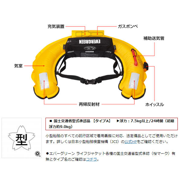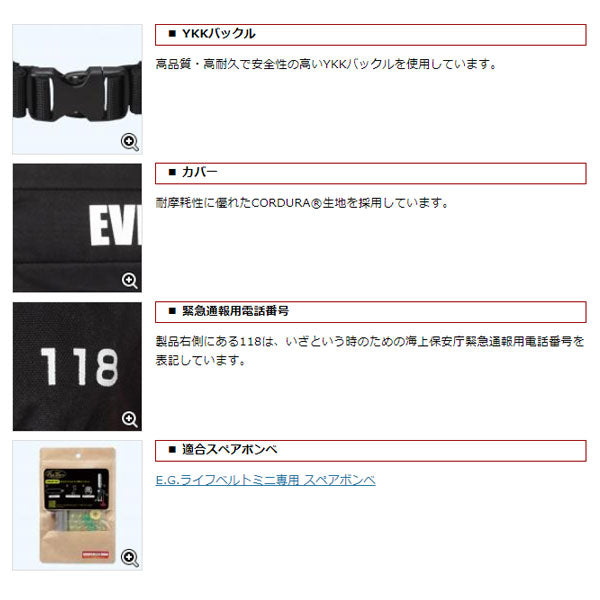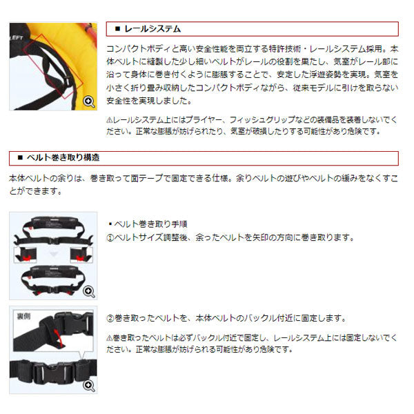 国土交通省型式承認モデル(自動膨脹タイプ) ライフベルトミニは、コンパクトで軽量なボディが特徴の腰巻型自動膨脹式救命胴衣です。体への接地面積が小さいため小柄な女性から大柄な男性まで様々な体型に無理なくフィット。また、軽いため長時間の着用でも負担が小さく快適です。さらに、特許技術・レールシステム採用により、従来モデルの約半分のボディサイズでありながら浮力・浮遊性能・落水後の膨脹性能において従来モデルに引けを取らない安全性を実現。国土交通省型式承認 小型船舶用救命胴衣 タイプAを取得していますので、小型船舶のすべての航行区域で着用義務に対応、法定備品として使用できます。