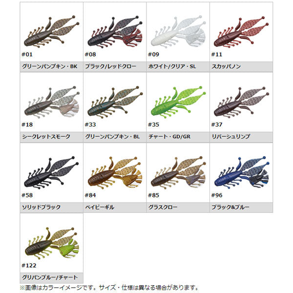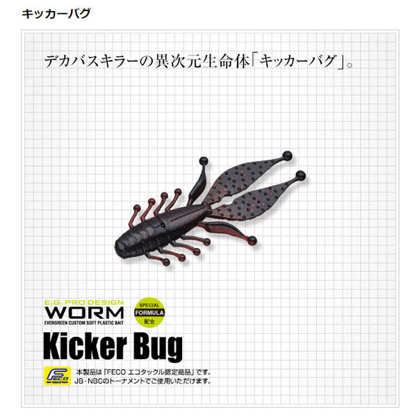 デカバスキラーの異次元生命体「キッカーバグ」。 菊元俊文デザイン「キッカーバグ」は、摩訶不思議な各パーツが各々別の動きを演じるバルキークローです。先端がボール状のレッグは独特の微振動を生み、フラッピンシザースは大きく水を動かし、着底後の倒れ込みでバイトを誘発。そのシルエットと独特のアクションはデカバスの本能を刺激し、強く深いバイトを誘発します。ジグトレーラーは勿論、テキサスリグ、ヘビーダウンショット、ヘビーキャロライナからノーシンカー、ネコリグまであらゆるリグでデカバスの実績を誇ります。デカバスキラーの異次元生命体「キッカーバグ」。