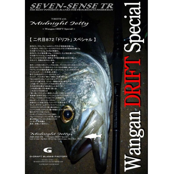 初代872、チタンフレームSiCリングガイド単体総自重4.9g。 二代目872、チタンフレームTORZITEリングガイド単体総自重2.7g。 その差マイナス2.2g。 44.9%の軽量化。 初代872、ロッド総自重140g。 二代目872、ロッド総自重127g(プロト)。 その差マイナス13g。 9.3%の軽量化。 モーメントはそのままに現時点で可能な軽量化は全て施した。 その上で、性能は初代を上回る。初代・二代目872共にティップ30t+40t、バット30t+40t+46tをコンポジットしている。 初代872のブランクス設計からバットに46tを搭載し始めており、TRブランクスの設計基盤を造ったロッドともいえるこの初代872をマンドレルテーパーの見直しを図り、若干ではあるがテーパーをUPさせ、ティップ、バット共に「張り」「感度」「反発力」を「MJLS-882-PE」のレベルに引き上げている。 リミテッドと違うのは、たった一種類の材料と製法のみ、この違いが、TRとリミテッドの決定的な差となっているのだが、その決定的な差は「超反発力」か否かであり、この性質は使い手を極端に選ぶ為、二代目872TRは言わば「使い易いリミテッド」に設計したと思って頂ければ話が早い。 港湾域で多用する5gシンペンから21gバイブを得意とし、アベレージの50cmクラスのバラシを軽減させ、80cmオーバーのランカークラスに余裕をもって対処できるバットパワーを併せ持つ。 そして、サブネームの「ドリフトスペシャル」は、フルキャストでギリギリ届く潮の流れに、シンペンを流しながらヨレ場や明暗にルアーを合わせ込み、極小のアタリであろうとも、フッキングできるブランクスに設計。 18gバイブと21gシンペンの「流し釣り」を最も得意とするこの二代目872TRでスレきった港湾鱸を是非、攻略して頂きたい。